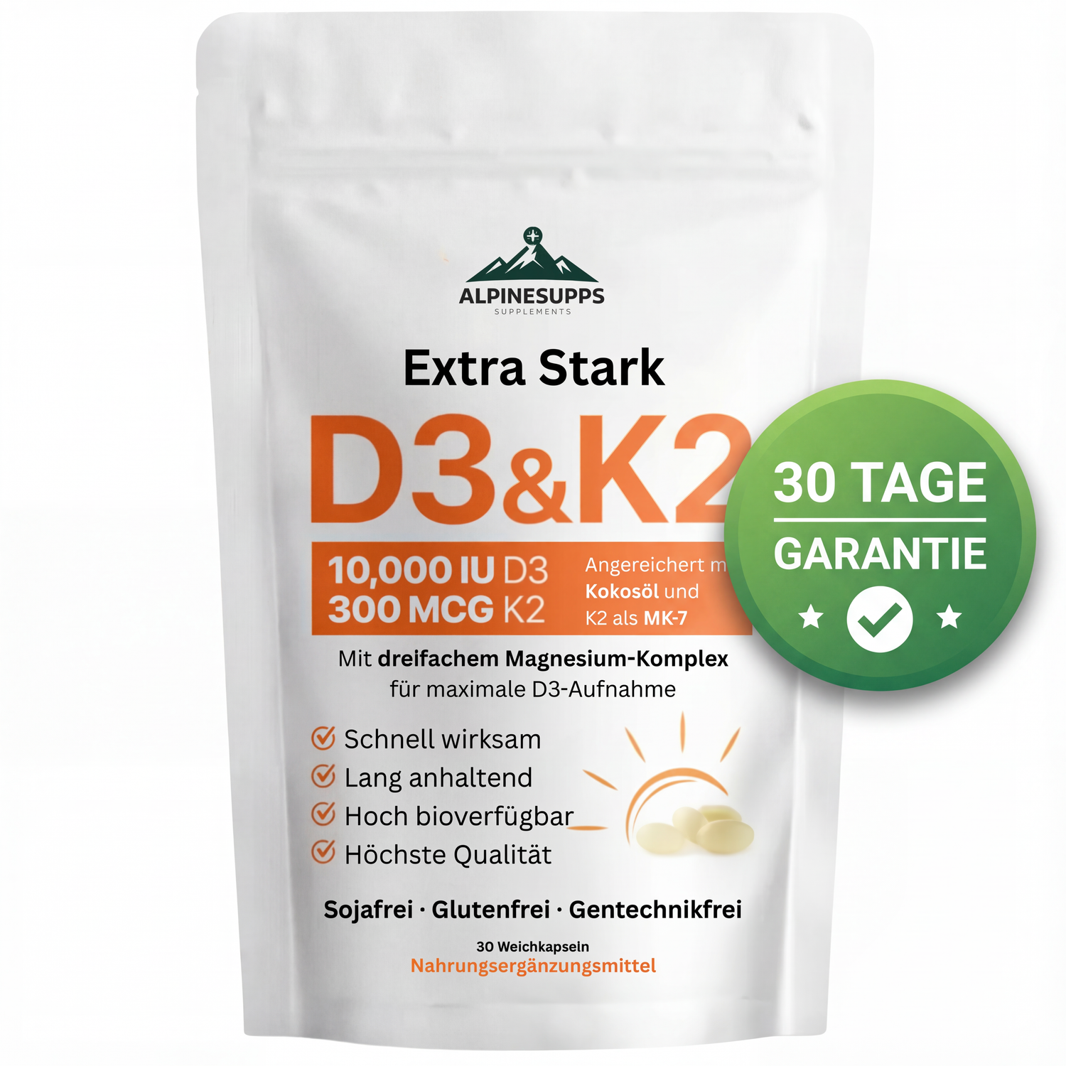 Kein Problem. Dank unserer 30-Tage-Geld-zurück-Garantie kannst du AlpineSupps D3+K2 Extra Stark ganz ohne Risiko ausprobieren.